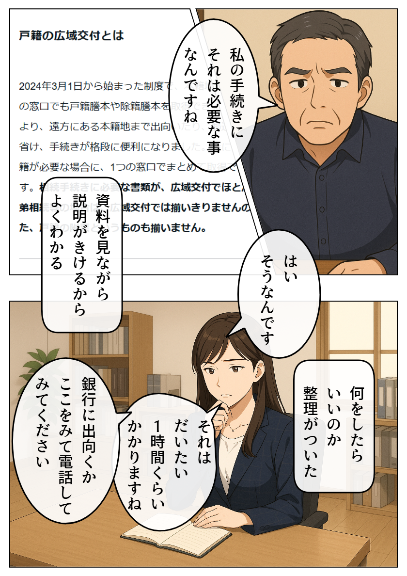 銀行窓口:「相続手続きの必要書類一覧を本日確認させてください。提出は後日まとめます。」