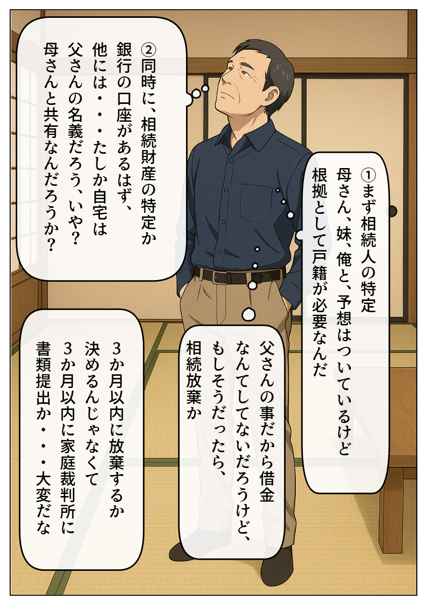 → 放棄・限定承認の3か月に注意。財産調査の記録を残し、伸長申立ても視野に。 -