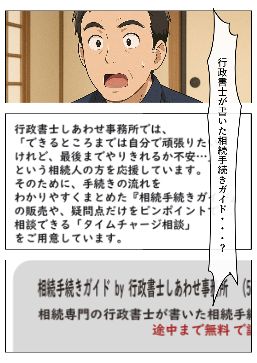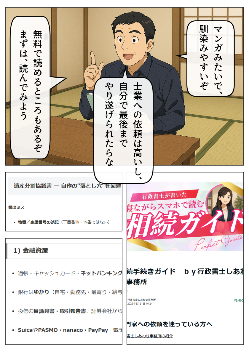 読み込むのは大変な作業だけど、楽したい人はぜひ 相続手続きガイド by 行政書士しあわせ事務所 (5500円 税込) を、ご購入ください。