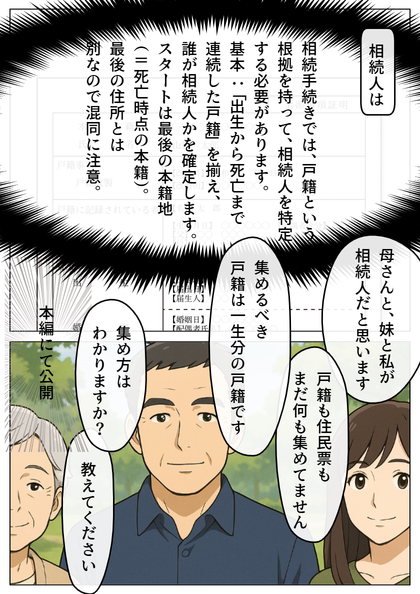 基本:「出生から死亡まで連続した戸籍」を揃え、誰が相続人かを確定します。